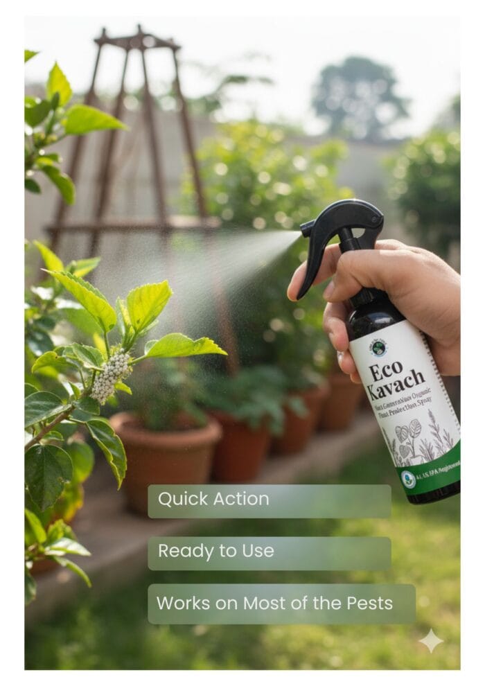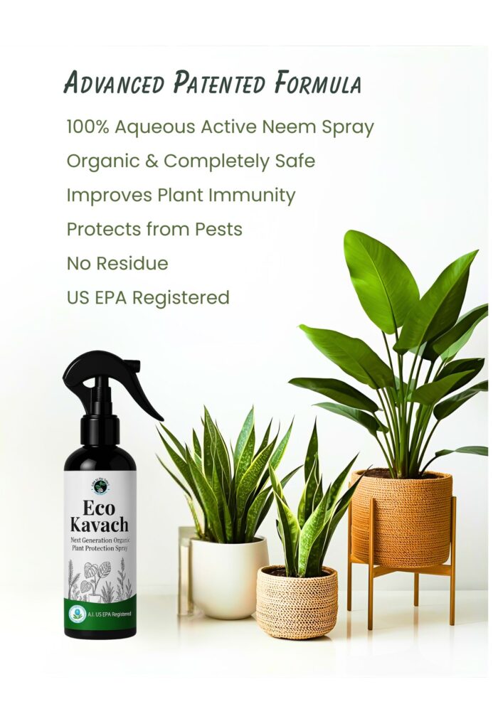 Worried about pests harming your plants? Common garden pests like mealybugs, aphids, thrips, and whiteflies can weaken your greens and stop their growth. **Eco Kavach** is a 100% herbal, **US-EPA registered** plant protection spray made from neem and other botanical extracts. It offers a **safe, eco-friendly way** to protect your plants naturally — keeping your garden healthy, green, and chemical-free.